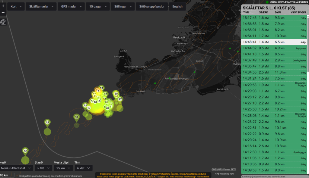 Wie Ingibjörg Andrea Bergþórsdóttir, Naturgefahren-Expertin beim Isländischen Wetterdienst, bei RUV schon gestern erklärte, seien Erdbebenschwärme in diesem Gebiet relativ häufig. Die Aktivität stehe in der Regel mit Plattenbewegungen entlang des Reykjanes-Rückens in Zusammenhang.