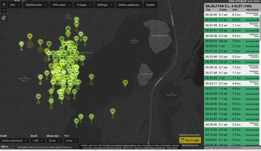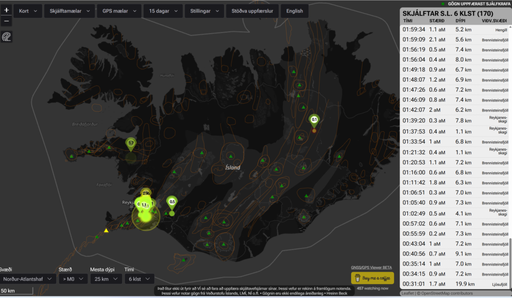 Die Erdbeben können bei vafri.is verfolgt werden. Hier ein Kartenausschnitt von Vafri.