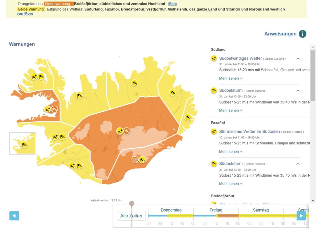 Gelb-Orangene Wetter-Warnung in ganz Island bis zum Wochenende