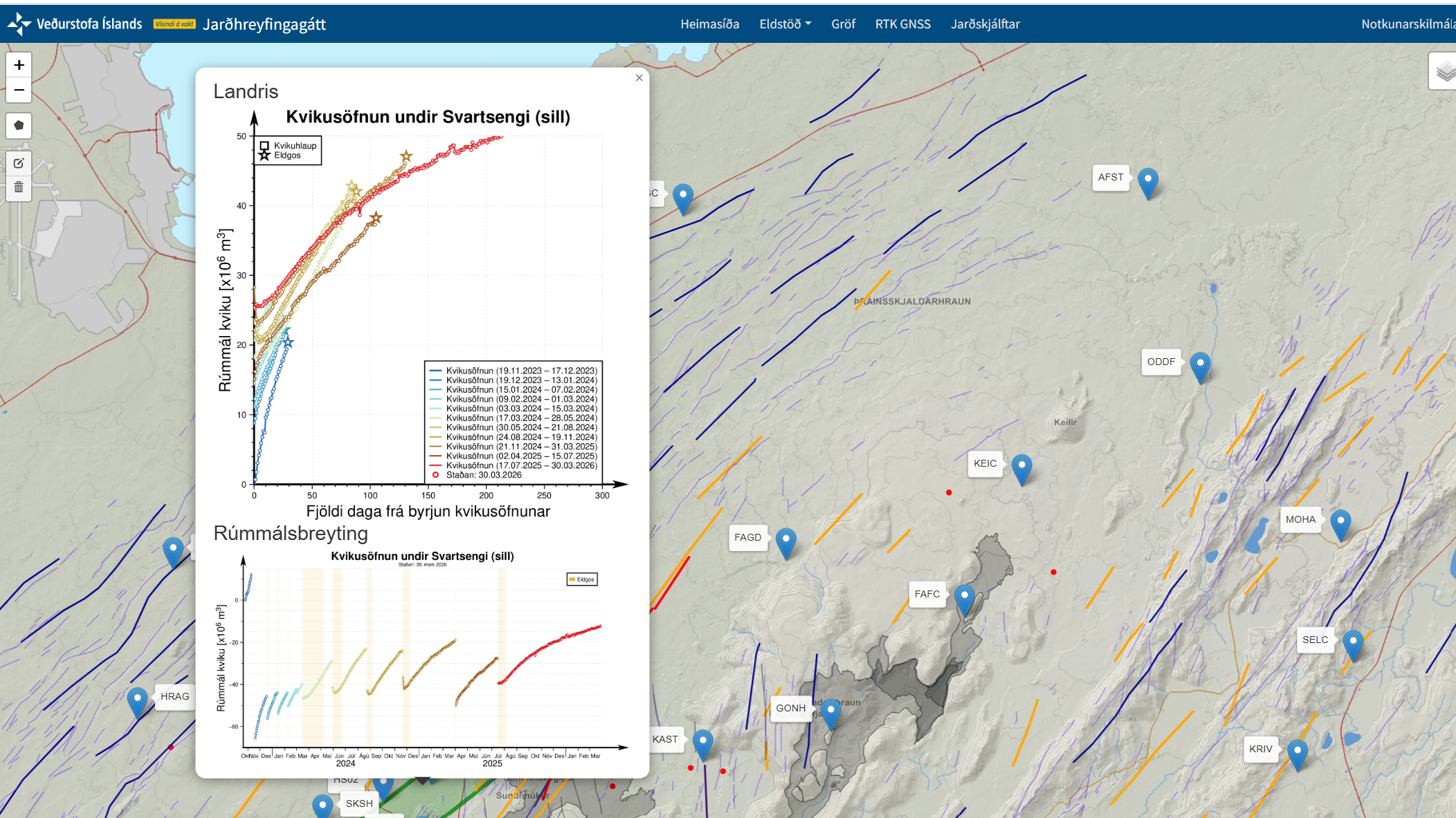 Der Svartsengi auf der Reykjanes-Halbinsel steht weiter im Fokus der Vulkanüberwachung. Laut aktuellem Update des Isländischen Wetterdienstes wurde seit Beginn der Eruptionsserie im November 2023 noch nie eine so große Magmamenge gemessen wie jetzt.