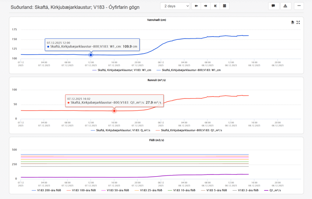 Bild 2: Skaftá, Kirkjubæjarklaustur – Die stromabwärts gelegene Station. Diese Station liegt weiter flussabwärts, in der Nähe der Ringstraße (Straße Nr. 1) und bewohntem Gebiet. Das Wasser benötigt Zeit, um von Sveinstindur hierher zu gelangen. Verzögerung: Während der Pegel in Sveinstindur (Bild 1) bereits am 7. Dezember massiv anstieg, zeigen die Kurven in Kirkjubæjarklaustur (Bild 2) erst ab dem 8. Dezember einen deutlichen Anstieg. Aktueller Status (laut Grafik): Die blaue Linie (Wasserstand) und die rote Linie (Durchfluss) zeigen, dass die Flutwelle nun (am 8. Dezember) diese Station erreicht. Der Durchfluss steigt an, liegt aber in der Grafik noch unter den historischen Hochwassermarken („Flóð (m³/s)“ – untere Grafik). Die lila Linie (aktueller Durchfluss) ist noch weit unter der braunen Linie (2-Jahres-Hochwasser). Das bedeutet, dass das Wasser zwar steigt, aber (zum Zeitpunkt dieser Momentaufnahme) noch keine unmittelbare Katastrophengefahr für die Infrastruktur bei Kirkjubæjarklaustur besteht, obwohl Wachsamkeit geboten ist.