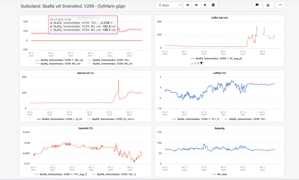 Die Daten zeigen einen Skaftárhlaup (Gletscherlauf der Skaftá). Geothermales Wasser sammelte sich unter dem Vatnajökull. Am oder um den 7. Dezember brach dieses Wasser aus und passierte die Messstation Sveinstindur (hoher Durchfluss, hohe Leitfähigkeit). Etwa einen Tag später (am 8. Dezember) erreichte die Flutwelle die bewohnte Gegend bei Kirkjubæjarklaustur. Wichtiger Hinweis: Anwohner meldeten einen deutlichen Schwefelgeruch, und Messungen bestätigen eine erhöhte Leitfähigkeit des Wassers. Diese Hinweise sprechen für das Auftreten von Schwefelwasserstoff, der beim Austritt von Schmelzwasser aus geothermischen Bereichen unter dem Vatnajökull freigesetzt wird. Reisende sollten sich vom Flussufer fernhalten.